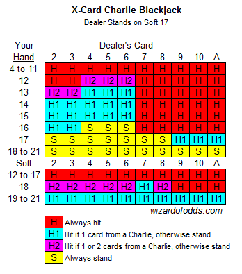 Пожалуйста. Для тех читателей, кто, возможно, не понял вопрос, «Чарли» — это правило, согласно которому игрок автоматически выигрывает, если берет еще одну карту на определенное количество раз, обычно от пяти до семи, не перебирая. В следующей таблице, для трех и более карт, показана основная стратегия, если игроку не хватает одной или двух карт до такого автоматического выигрыша.