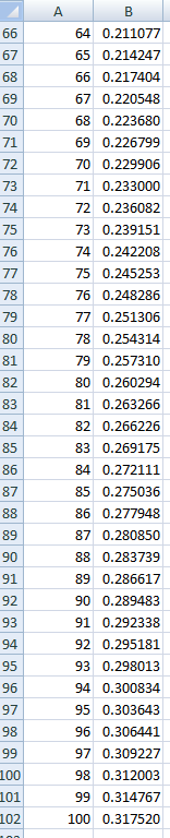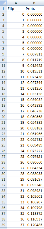 Затем я скопировал и вставил это из ячейки B10 в ячейку B102, что соответствует 100 броскам. Вероятность составляет 0,317520. Случайное моделирование это подтверждает.