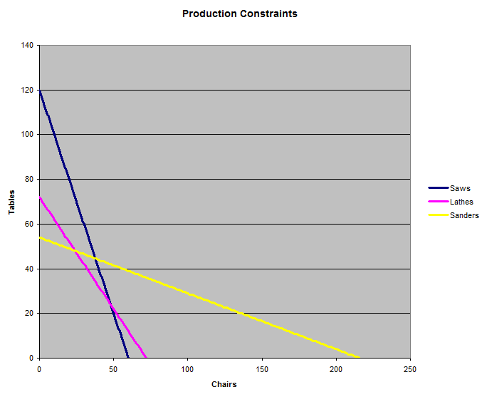Шесть токарных станков обеспечивают 360 минут токарной обработки в час. Нам было дано, что на изготовление стула уходит 5 минут на распиловку, а на стол — 5 минут. Таким образом, почасовая производительность ограничивается следующими значениями: