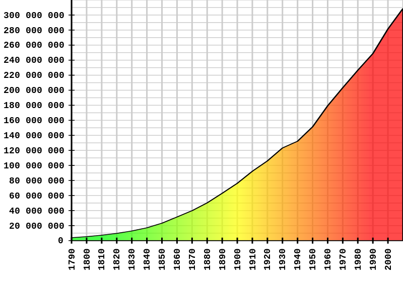 Однако численность населения нестабильна. Судя по этому графику, население США растет на 10,71% за десятилетие. Это составляет 1,02% в год. Давайте для простоты примем за 1%.