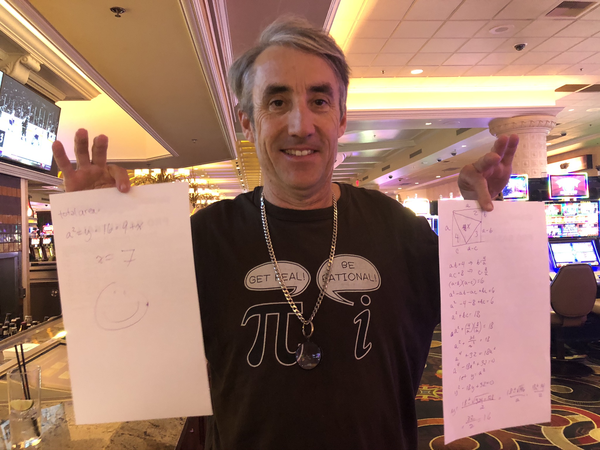 Обратите внимание на мою футболку на этом снимке. Кассирша в кинотеатре похвалила её, когда я ходила смотреть «Неограненные алмазы» . В благодарность я замучила её этой задачей, только с треугольниками с площадями 2, 3 и 4. После фильма я подошла к ней, чтобы узнать, как она, и она всё ещё не решила задачу, но, казалось, пыталась. Поэтому я записала для неё следующее решение в баре «Санкост». Ей, кажется, это даже понравилось. Думаю, эта молодая женщина многого добьётся в жизни.