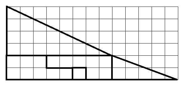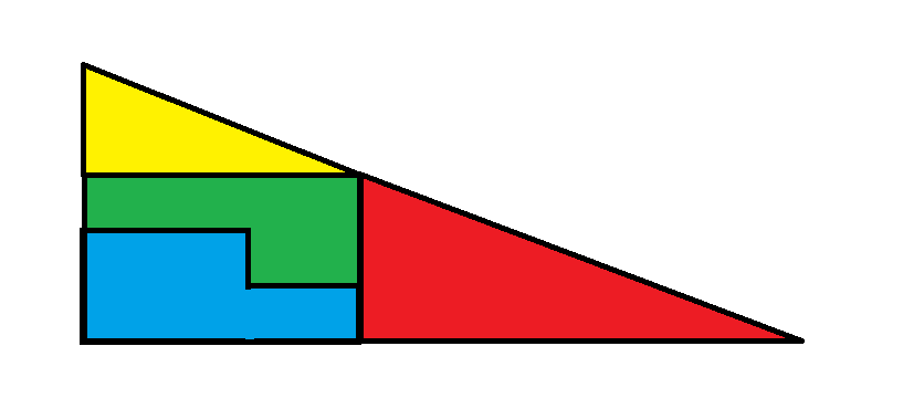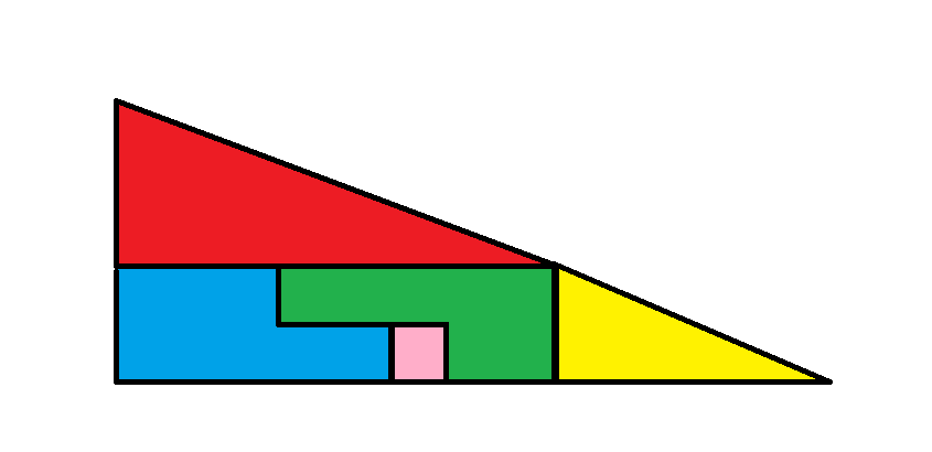 Обратите внимание, что у большого красного треугольника стороны равны 4 и 8. Затем обратите внимание, что у меньшего желтого треугольника стороны равны 2 и 5. Другими словами, треугольники не пропорциональны. Гипотенузы двух треугольников имеют разные наклоны, как показано на рисунках. У одного наклон равен 0,5, а у другого — 0,4. Если расположить детали так, как показано на рисунках, может показаться, что они образуют большой треугольник со сторонами 5 и 13, но это не треугольник.
