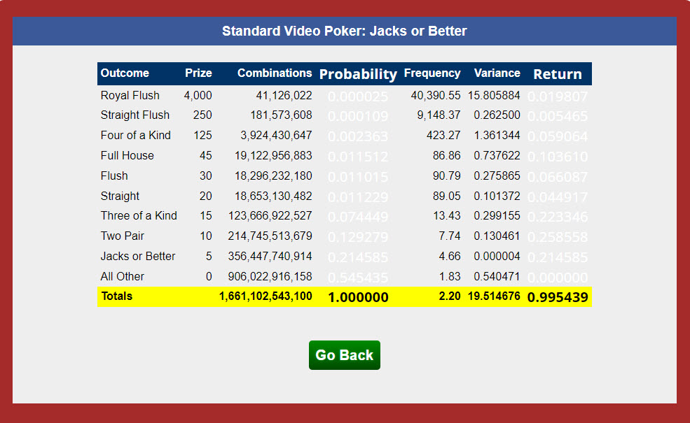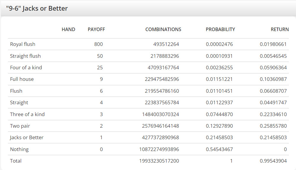 На вашем калькуляторе для видеопокера 9-6 Jacks or Better указано общее количество комбинаций — 1 661 102 543 100. В то же время на вашей странице Jacks or Better указано 19 933 230 517 200. Мне кажется, количество комбинаций должно быть одинаковым. Интересно, почему такая разница? Выигрыш (0,995439) кажется одинаковым.