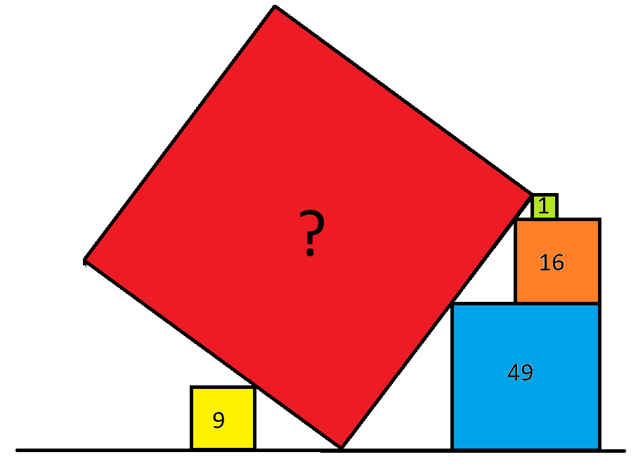 На изображении выше числа обозначают площади четырех квадратов. Какова площадь красного квадрата?
