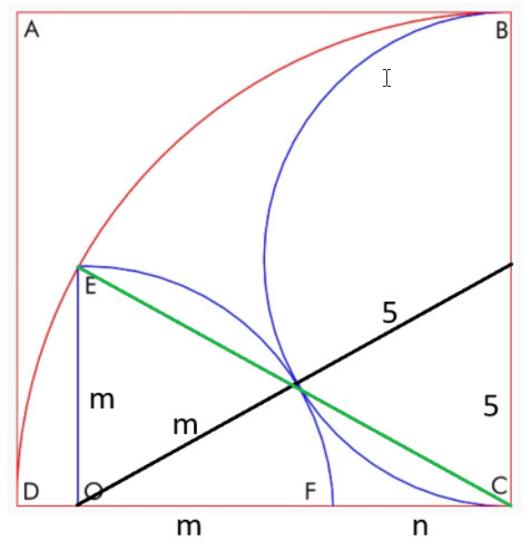 ABCD — квадрат со стороной длиной 10. Внутри него вписаны полукруг и четвертькруга, как показано на следующем рисунке.