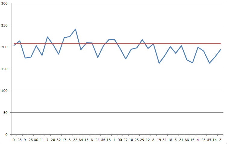 На следующем графике показаны ваши результаты в хронологическом порядке на колесе. Синяя линия показывает ваши результаты. Красная линия — это число, которое вам нужно, 207,11, чтобы преодолеть преимущество казино в 5,26%.