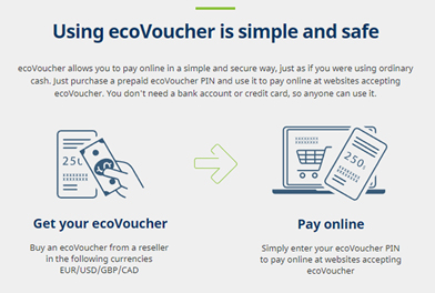 Как указано на официальном сайте, ecoVoucher — это предоплаченный электронный платежный сервис, позволяющий пользователям переводить средства максимально быстро и безопасно. Однако у этого решения есть еще одно преимущество: оно позволяет пополнять ваш ecoAccount, или, точнее, ваш ecoPayz .