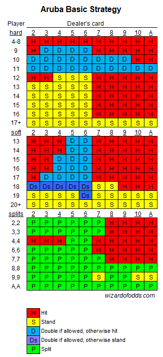 За исключением нескольких случаев, все правила блэкджека, похоже, сводятся к шести колодам, выплата за блэкджек 3-2, дилер берет карту при мягкой 17, удваивает ставку при любых двух картах, удваивает ставку после разделения разрешен, сдача запрещена, а повторное разделение тузов запрещено. К сожалению, блэкджек 6-5 заполонил Арубу. Я также видел игру с двумя колодами в казино Orchid в RIU. Я бы примерно оценил, что 60% столов использовали автоматическое перемешивание, 30% — ручное, и 10% — непрерывное перемешивание. Распространенность первых двух типов составила около 2/3. Ниже приведена основная стратегия по правилам Арубы: