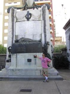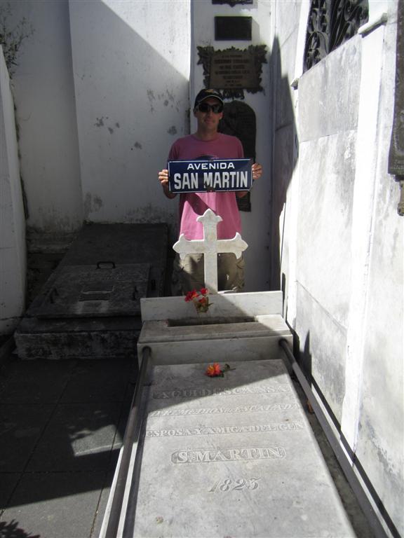 Склеп Хосе де Сан-Мартина (1778-1850), бывшего генерала Аргентины. Генералу Сан-Мартину приписывают большую часть заслуг в победе в войне за независимость от Испании. В Буэнос-Айресе повсюду есть объекты, названные в его честь. Я держу в руках старый указатель улицы Авенида Сан-Мартин, который случайно оказался у меня с собой, когда я был на кладбище.