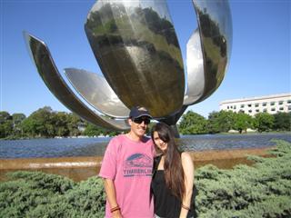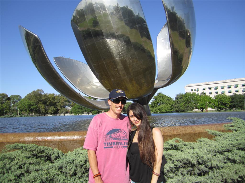 Моя очаровательная гид София и я в парке Карлоса Тайса. А позади нас огромный металлический цветок.