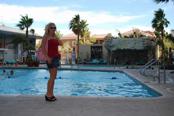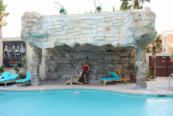 В отеле Hooters есть довольно внушительный бассейн для отеля такого размера. На самом деле здесь три бассейна и два спа-салона. Вокруг бассейнов около 50 шезлонгов, примерно дюжина пальм, небольшая песчаная зона и водопад. Водопад не работал, когда я фотографировался с Лизой, но он был в рабочем состоянии, когда я вернулся неделю спустя. Рядом находится бар «Nipper’s», где можно выпить, но он был закрыт, когда я делал фотографии.