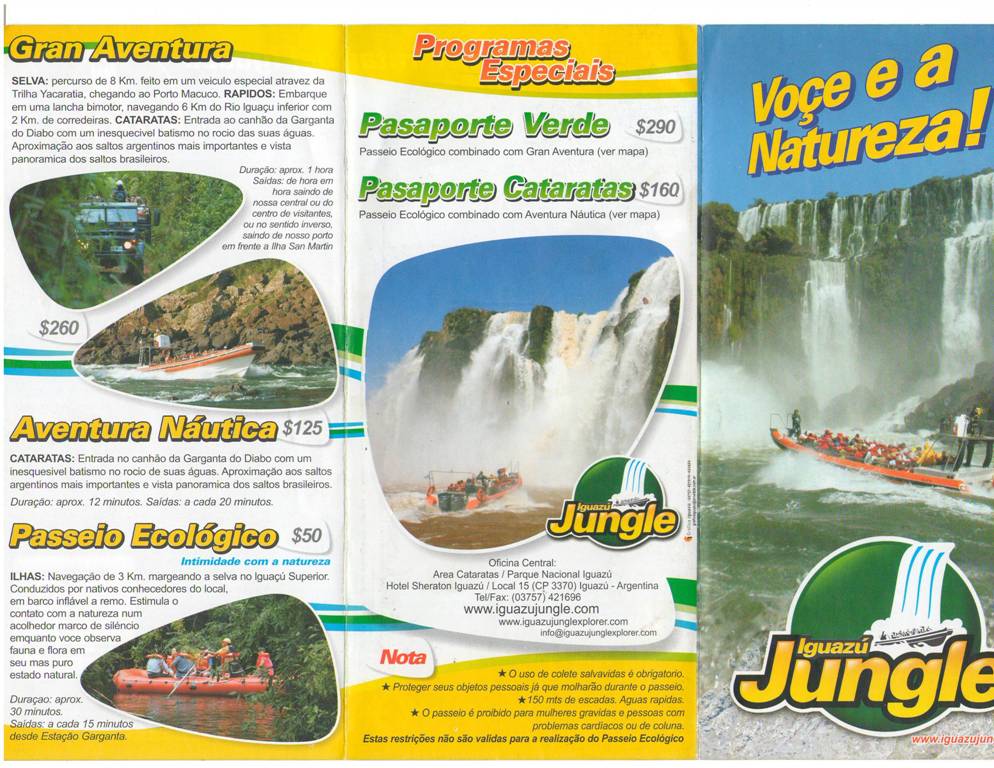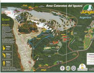 Сначала расскажу, как добраться до водопадов. От автовокзала Пуэрто-Игуасу и других мест ходят общественные автобусы до Национального парка Игуасу (Parque Nacional Iguazú) за 10 песо. Тот, на котором я ехал, был переполнен, и некоторым людям приходилось стоять. Поездка занимает около 20 минут, так что за комфорт такси я бы заплатил немало.Сами водопады находятся в национальном парке, вход в который для взрослых стоит 40 песо (около 9 долларов США). Также есть частная компания, которая организует лодочные экскурсии по парку, её киоск расположен сразу за воротами парка. Вот скан их карты парка, на которой также указаны предлагаемые ими виды деятельности. Извините, она на португальском языке.