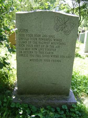 Зная название кладбища и номер могилы (секция C, номер 1369), я доехал на метро до нужного района и отправился на поиски печально известного надгробия. Это оказалось проще сказать, чем сделать. Я вышел через университетский выход, который граничит с кладбищем, но мне пришлось пробираться через несколько зданий, чтобы найти высокий и острый забор, препятствующий переходу между двумя местами. Поэтому я некоторое время шел пешком, чтобы найти вход. К счастью, у входа лежала карта, которая указывала мне направление к секции C. Тем не менее, это было огромное кладбище со странной формой секций, и я начал с неправильной стороны. В конце концов, я нашел подсекцию секции C с номерами могил в нужном мне диапазоне. Это была довольно небольшая секция, но мне было трудно найти нужную могилу. У большинства из них не было номеров. Я проверил каждое надгробие на наличие стихотворения, но не смог его найти. Неужели слишком много зевак, подобных мне, заставили их изменить надгробие или перенести его в другое место? Наверняка у администрации кладбища тоже есть чувство юмора, и они бы к этому не притронулись. Почесав затылок, я решил посмотреть на надгробия с обратной стороны, потому что в этом разделе номера надгробий не были на лицевой стороне, как в других. Это быстро привело меня к нужному месту: я нашел искомое стихотворение на ОБРАТНОЙ стороне надгробия. Почему-то у меня в голове сложилось впечатление, что оно находится на лицевой стороне. Поэтому я сделал несколько снимков с таймером и как можно грациознее, с широкой ухмылкой на лице, покинул кладбище.