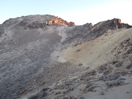 Начало подъема представляет собой простую тропу. Во время подъема наш гид упомянул, что после этого нам предстоит долгая поездка в город Пуэбла, и если мы не достигнем вершины к 11:00, нам придется повернуть обратно. Это вызвало у нас некоторое беспокойство, так как Сьюзен поднималась медленнее меня. Ситуацию усугубляло то, что у гида не было часов. Спросив у меня время, он предложил продолжать подниматься медленно и оценить ситуацию, когда мы доберемся до высокогорной хижины Рефухио.