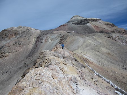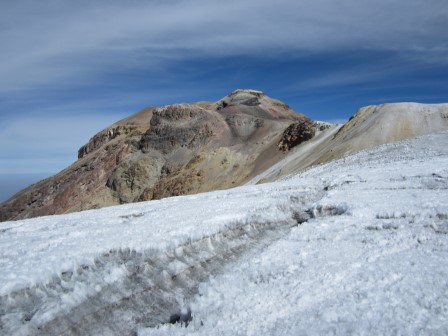 Пересекая острый как лезвие хребет с ревущими серными фумаролами с одной стороны, мы достигли места, откуда открывался вид на ледяное поле недалеко от вершины. Чтобы добраться до ледяного поля, нужно было спуститься по крутому уступу, либо по рыхлым камням, либо по льду. Оглядываясь назад, я понимаю, что мне следовало надеть кошки и спуститься по льду. Я тащил их всю дорогу вверх, и было бы неплохо ими воспользоваться. Однако гид постоянно напоминал мне, что у нас мало времени, поэтому я по глупости решил спуститься по крутому и рыхлому осыпному склону, используя метод самостраховки. Я спустился гораздо быстрее, чем ожидал. Оказалось, причина была в том, что осыпь представляла собой всего лишь тонкий слой камня поверх льда. К счастью, я спустился, отделавшись лишь незначительными порезами на левой ноге.