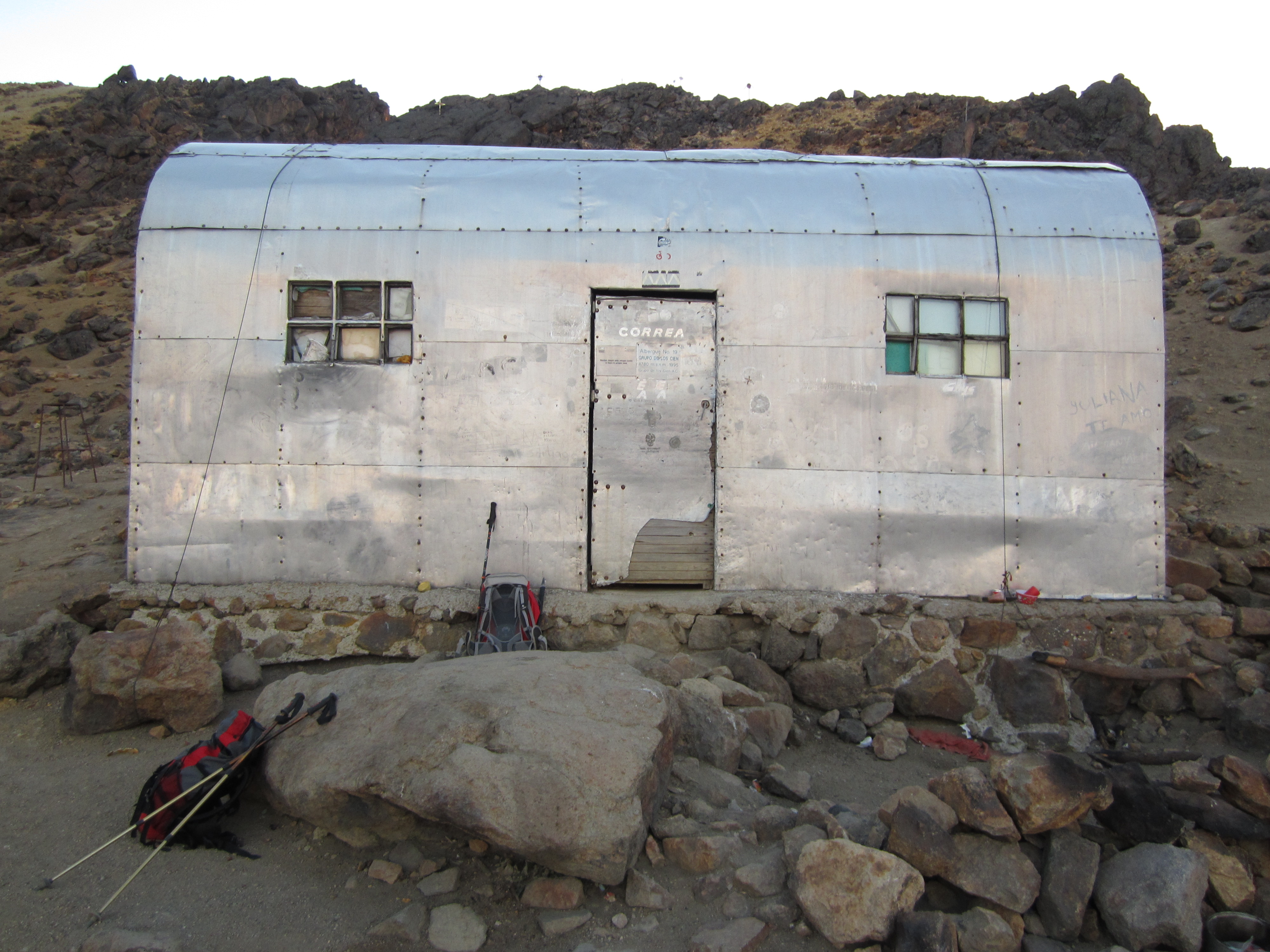 Когда мы наконец добрались до хижины Рефухио около 3:00 утра, в холод и ветер, мы встретили трех других альпинистов, которые готовились к отъезду. Примерно через полчаса они ушли, и в хижине вдруг стало так уютно, темно и тихо. Затем, несмотря на строгий график, мы все уснули. Кто-то любезно оставил мексиканское одеяло, которое я использовал, чтобы согреться, а шлем — в качестве подушки.