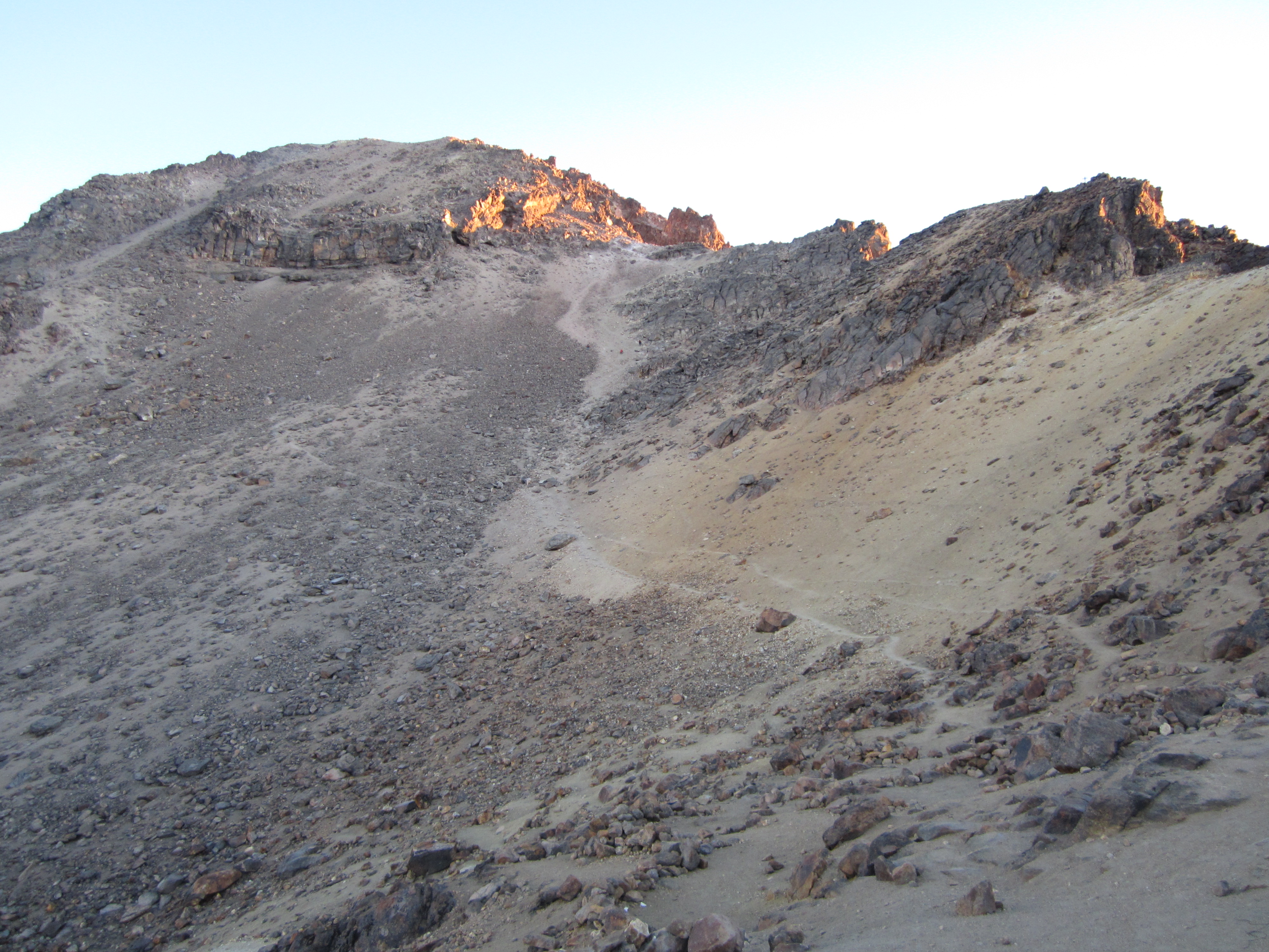Возвращаясь к просьбе о воде, я начал восхождение с двумя литрами. На момент просьбы у меня оставалось около 1,2 литра, распределенных между двумя литровыми бутылками. Не желая увеличивать свои шансы заразиться какой-либо болезнью, которая беспокоила моего проводника, я спросил его по-английски, есть ли у него пустая бутылка, в которую я мог бы налить немного своей воды. Он ответил: «Нет». Следует отметить, что мне нужно было достаточно воды, чтобы добраться до вершины и вернуться обратно к парковке. Ему же нужно было лишь столько воды, чтобы добраться до вершины и вернуться в хижину за забытой водой.