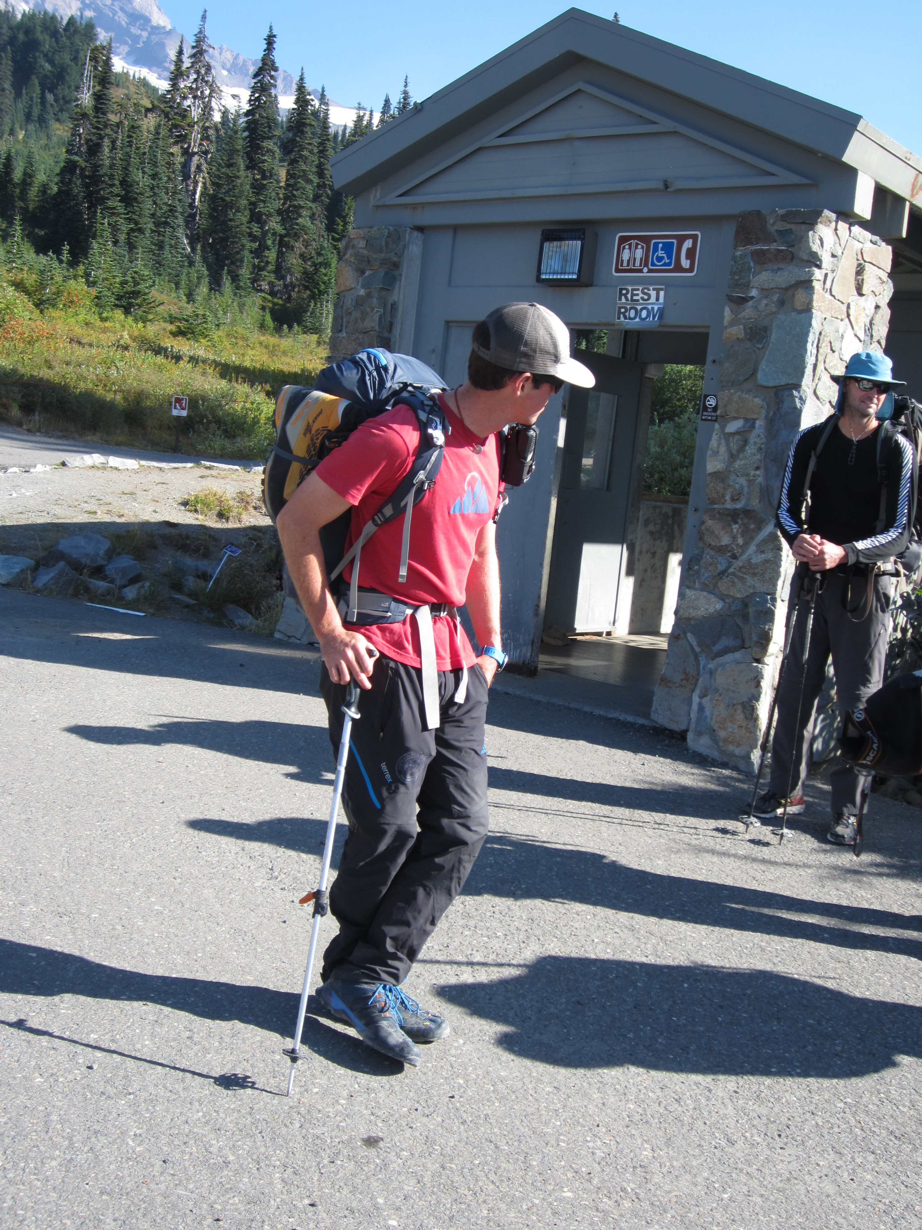 Прибыв в Парадайз, к подножию горы Рейнир, мы довольно далеко поднялись в гору по хорошо обустроенным тропам. Для справки, предыдущая зима на западном побережье была очень засушливой. Именно поэтому в Калифорнии сейчас серьезная засуха из-за низкого снежного покрова в горах Сьерра-Невада. Затем наступило необычно жаркое лето. Оба этих фактора привели к очень низкому ледовому покрову на горе Рейнир. Нам пришлось идти около 90 минут, далеко за Пеббл-Крик, чтобы добраться до достаточно большого и крутого снежного сугроба, на котором можно было тренироваться.