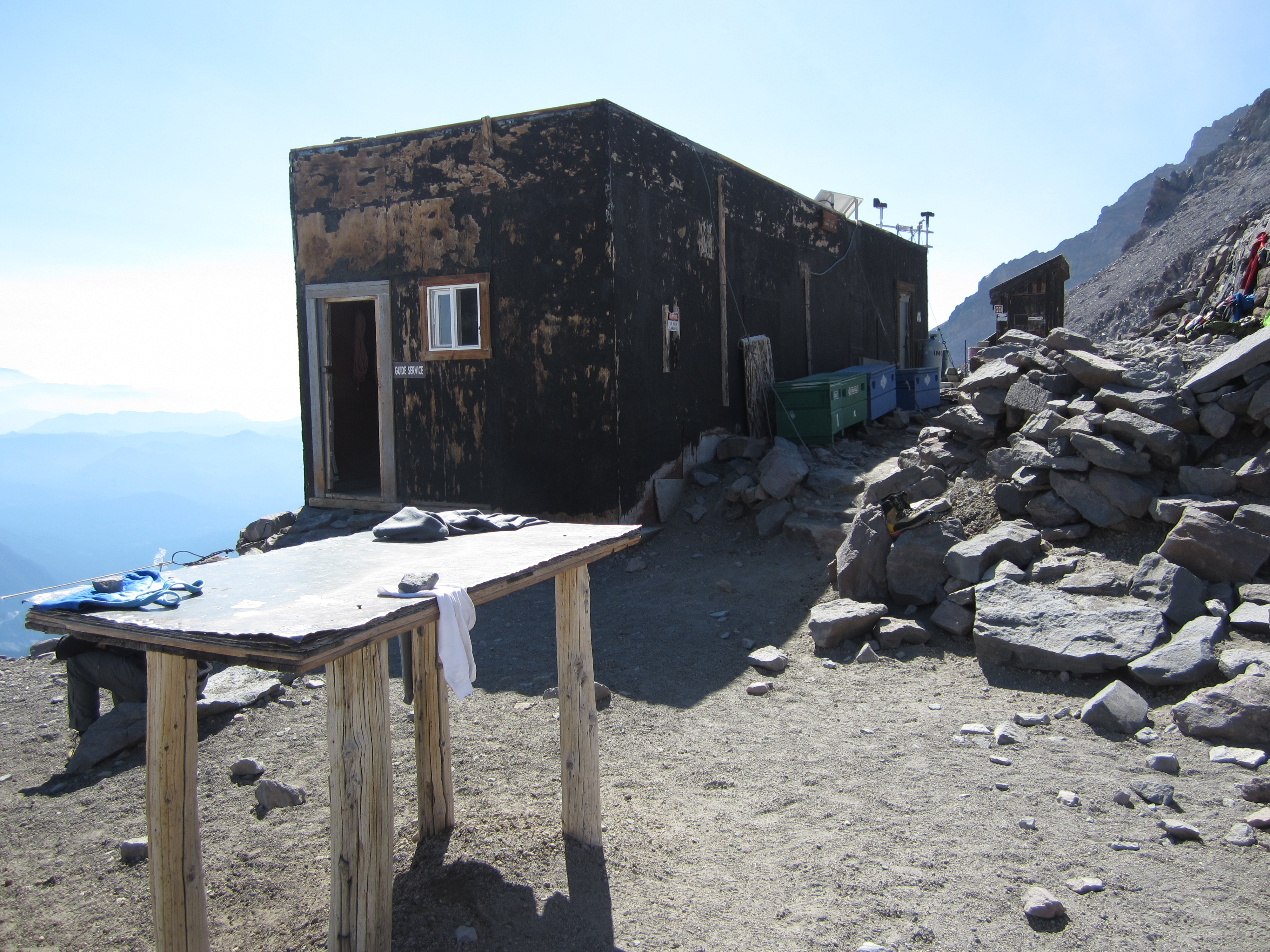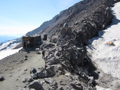 Мы прибыли в лагерь Мьюир примерно в 14:30. Лагерь представляет собой простой комплекс построек на вершине последнего снежного поля, перед началом ледников. Там было два общежития — одно для двух компаний, организующих экскурсии, а другое для всех желающих. Кроме того, там были туалеты, закрытое здание рейнджера, небольшая хижина гида и несколько других строящихся зданий. Это было прекрасное время, чтобы расслабиться, поесть как можно больше и подготовиться к предстоящему дню. В это время гиды обрабатывали многочисленные мозоли гостей пластырем и наклеивали много скотча* на ноги других гостей.