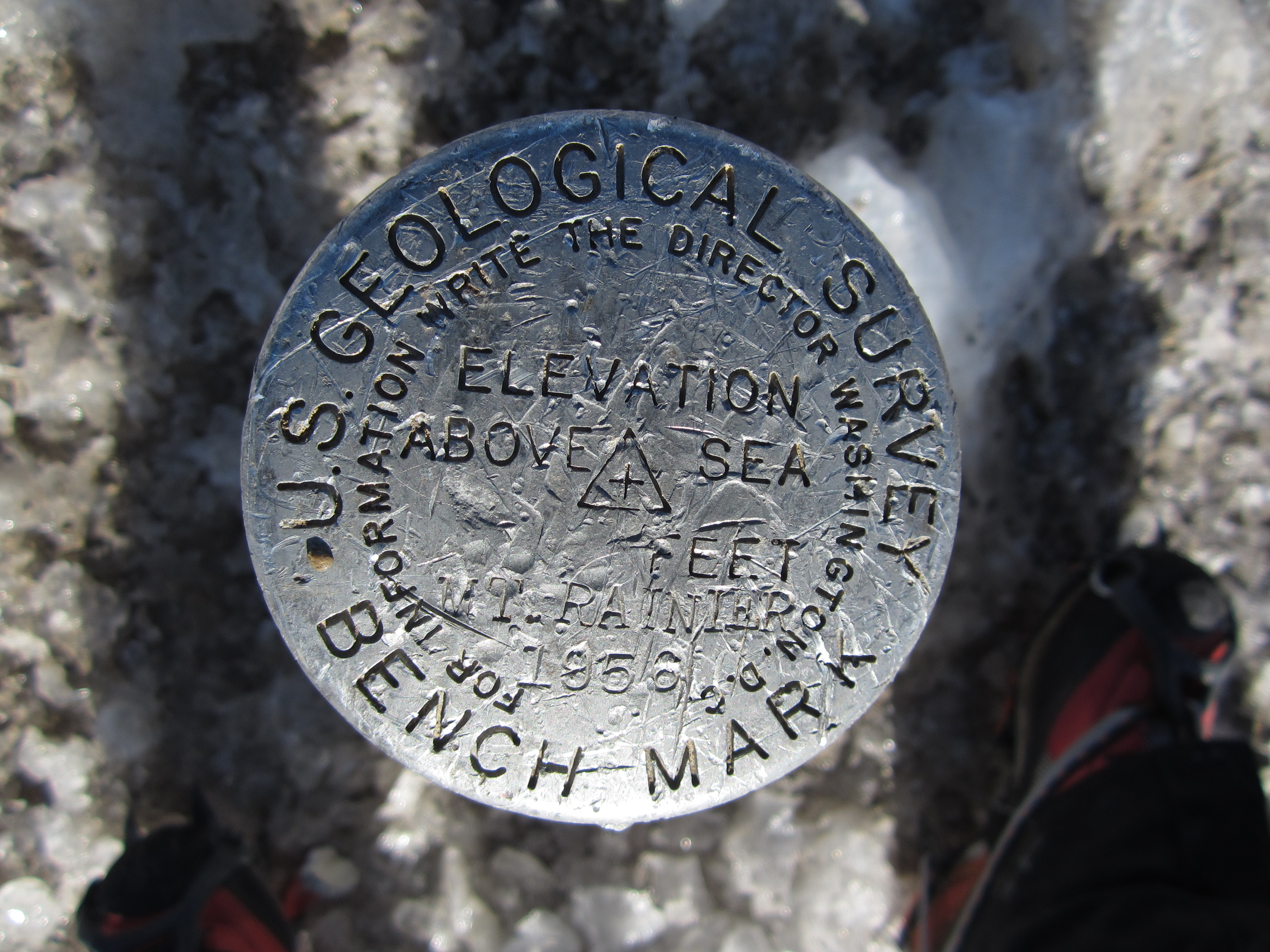 Позвольте мне сделать паузу и сказать, что если кто-то добирается до кратера, то, на мой взгляд, он покорил Рейнир. Однако я знал, что меня много раз спросят, достиг ли я вершины, и не хотел ходить вокруг да около. Поэтому, ради дополнительных баллов и потрясающих видов на север от Рейнира, включая гору Бейкер, я дошёл до геологического указателя на самой высокой точке и расположенного неподалеку регистрационного журнала.