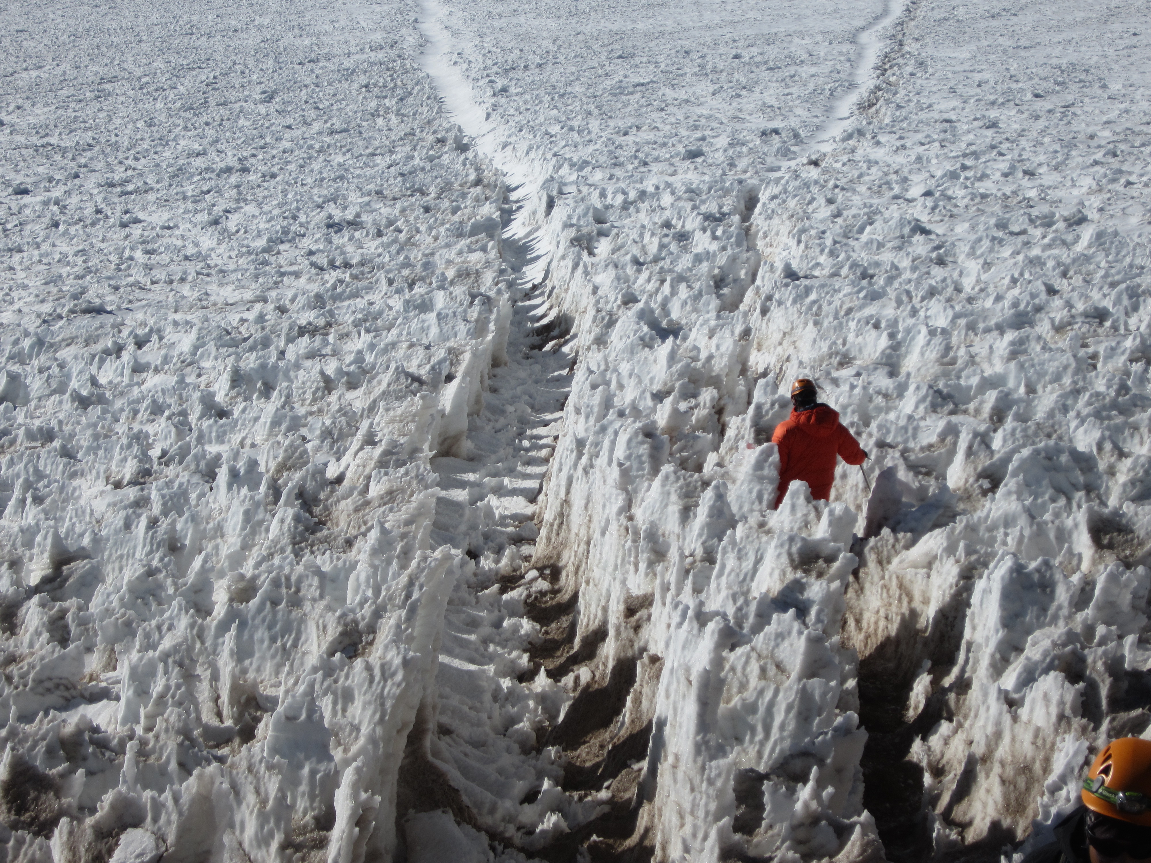 Хотя я и устала, спуск с большой высоты приятен, потому что чувствуешь, как возвращаются силы и дыхание, а не истощаются. Было очень интересно увидеть некоторые участки, по которым мы поднимались, в темноте ясным утром.Некоторые участки, особенно вершины ледников Ингрэм и Коулитц, были действительно довольно пугающими. Мы также прошли мимо глубоких трещин, которые были завораживающими и красивыми, и которые я не смог оценить в темноте.