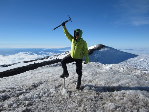 Наконец, моя команда из трёх человек достигла края кратера и спустилась внутрь. Это было прекрасно. Этот момент оправдал все усилия, приложенные для того, чтобы добраться туда. Кратер представлял собой огромное круглое снежное поле, окружённое скалистым краем и фумаролами. Лучшей погоды на вершине и желать нельзя. Было умеренно холодно и ветрено — достаточно прохладно, чтобы напоминать о том, где ты находишься, но не настолько холодно, чтобы чувствовать себя некомфортно.