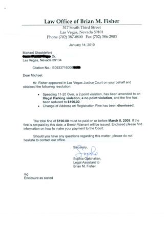 Я ожидал, что обвинение в неправильном адресе будет снято, потому что я отправил адвокату копию свидетельства о регистрации с правильным адресом, а оригинал — в суд. Как видно из письма, ему удалось добиться от суда изменения обвинения с превышения скорости на «незаконную парковку», что сняло штрафные баллы и снизило предполагаемый штраф до 190 долларов. Я говорю «предполагаемый», потому что если бы я урегулировал дело, позвонив по номеру телефона, указанному на обороте квитанции, штраф все равно составил бы 190 долларов. Именно этого я и ожидал, так что все хорошо, что хорошо кончается.