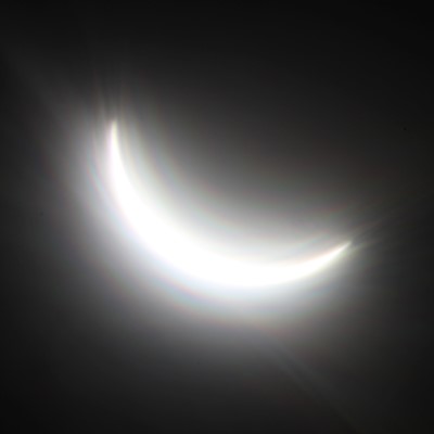 К счастью, в магазине продавался один-единственный, очень дорогой рулон скотча. К сожалению, после всех моих усилий по заклеиванию, всё же остались дырки, через которые могло просвечивать солнце. К счастью, у меня в походном снаряжении был карманный нож, поэтому я разобрал запасные очки для наблюдения за затмением и заклеил линзы. К сожалению, изображение солнца сквозь весь этот скотч и дополнительные линзы получилось размытым и искаженным. Кроме того, я взял с собой GoPro, чтобы снять видео всего происходящего. Я установил её на крыше ближайшей машины. Вид из моей машины был загорожен телефонным столбом. После того, как я повозился с солнечным фильтром для камеры и нашел идеальное место для своей GoPro, оставалось только ждать. Точно по расписанию, в 9:10 утра, началось частичное затмение. Я делал снимки каждые несколько минут. Позже я узнал, что преданные охотники за затмениями оплатили места для кемпинга у местной школы. Это оставило меня единственным астрономическим фанатиком в центре города с мощным штативом и двухфутовым объективом на камере. Впервые за мои 52 года мой интерес к астрономии немного помог мне в отношениях с женщинами. Несколько из них, казалось, были впечатлены моей аппаратурой. Конечно, я любезно предложил им посмотреть на частичное затмение через мою камеру. У меня состоялся приятный разговор с симпатичной румынкой, которая приехала посмотреть свое третье полное затмение. Слава богу, научных фанатиков с большими объективами и телескопами нигде не было видно. Мне нравились не только женщины; я прекрасно провел время, общаясь со всеми. В то время и в этом месте все были там по одной и той же причине. Это было похоже на идеальный мир из песни Imagine — не было разделений по политическим, расовым или религиозным признакам. Все были дружелюбны и общительны. Одно событие объединило нас всех, и, по крайней мере, это было нашим общим увлечением.По мере приближения полной фазы явления люди занимали свои места. Температура падала. Небо темнело. Толпа затихла. Мое сердце бешено колотилось.