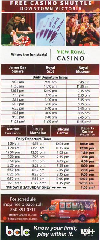 Однако в этом не было необходимости. До отеля View Royal легко добраться из центра Виктории. Приветливый персонал в информационном центре во внутренней гавани Виктории дал мне брошюру о казино и расписание бесплатного шаттла. Этот шаттл курсирует каждые 90 минут, делая шесть остановок в центре Виктории, включая Королевский музей.