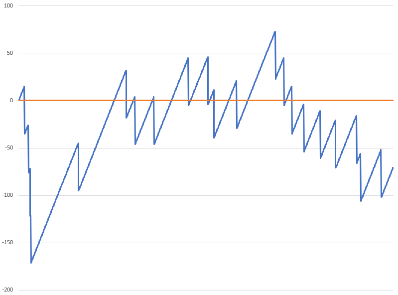 Следующая симуляция основана на ставке «не проходит» в крэпсе . Размер симуляции составил более 76 миллиардов сессий. Напомним, что преимущество казино на ставке «не проходит» составляет 1,364%.