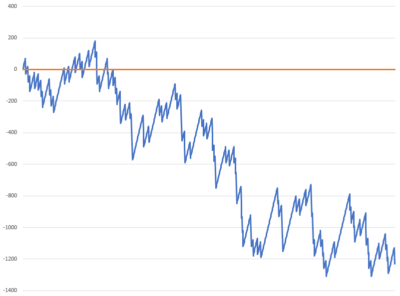 Следующая симуляция основана на ставке «не проходит» в крэпсе . Размер симуляции составил более 6 миллиардов сессий. Напомним, что преимущество казино на ставке «не проходит» составляет 1,364%.