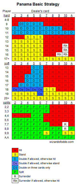 Преимущество казино при этих правилах очень низкое и составляет 0,12% при непрерывном перемешивании карт или 0,14% без него. В этой статье я привожу базовую стратегию по панамским правилам. Ниже приведена базовая стратегия по панамским правилам.