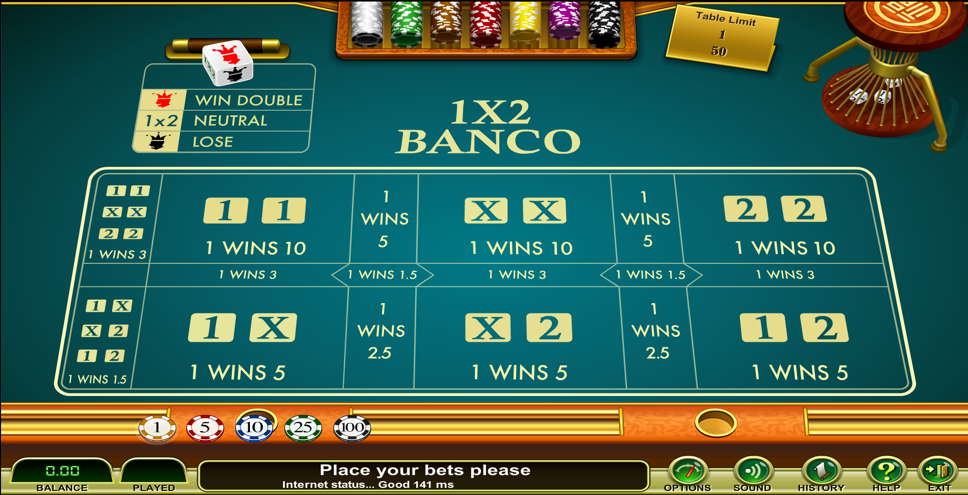 Все таблицы в этом разделе основаны на игральной кости «Босс» со следующим распределением граней: выигрыш — двойная ставка (1 грань), нейтральная ставка (3 грани), проигрыш — 2 грани.