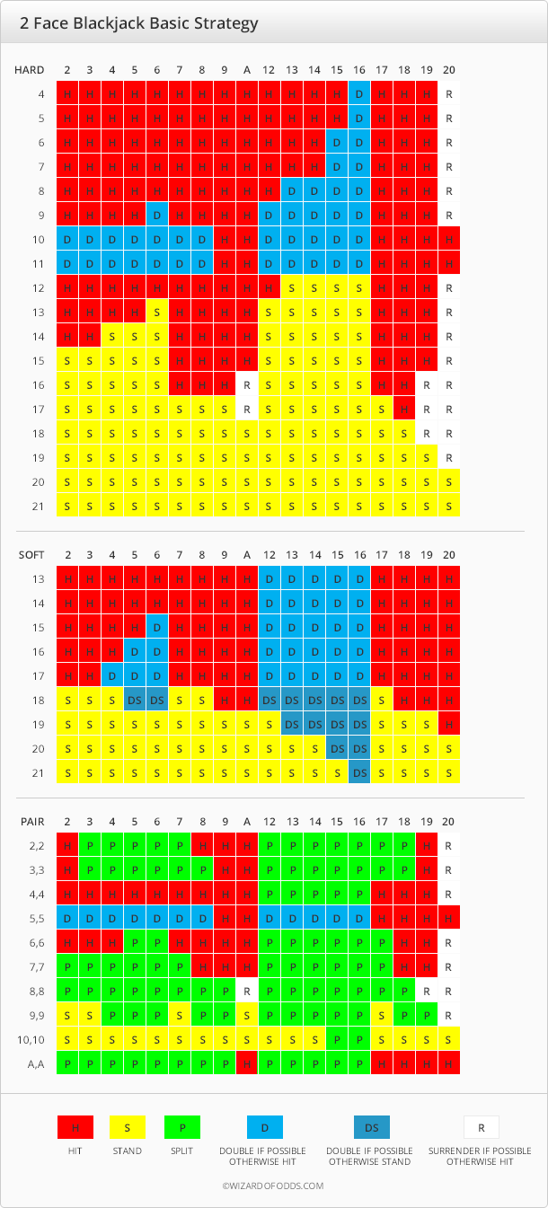 «Два лица в блэкджеке» — это разновидность блэкджека, в которой дилер показывает свою закрытую карту, если его открытая карта — любая карта с изображением. Для выплаты выигрыша используются колоды из 48 карт без десяток, а выигрышный блэкджек оплачивается в равных суммах. Впервые я увидел эту игру в казино Paris в Лас-Вегасе 18 ноября 2013 года.