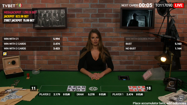В версии 21 Bet от TvBet игрок делает ставки на каждом этапе игры на то, кто выиграет или будет ничья, на количество карт в выигрышной комбинации, на количество очков в выигрышной комбинации или на то, проиграет ли кто-либо из игроков.