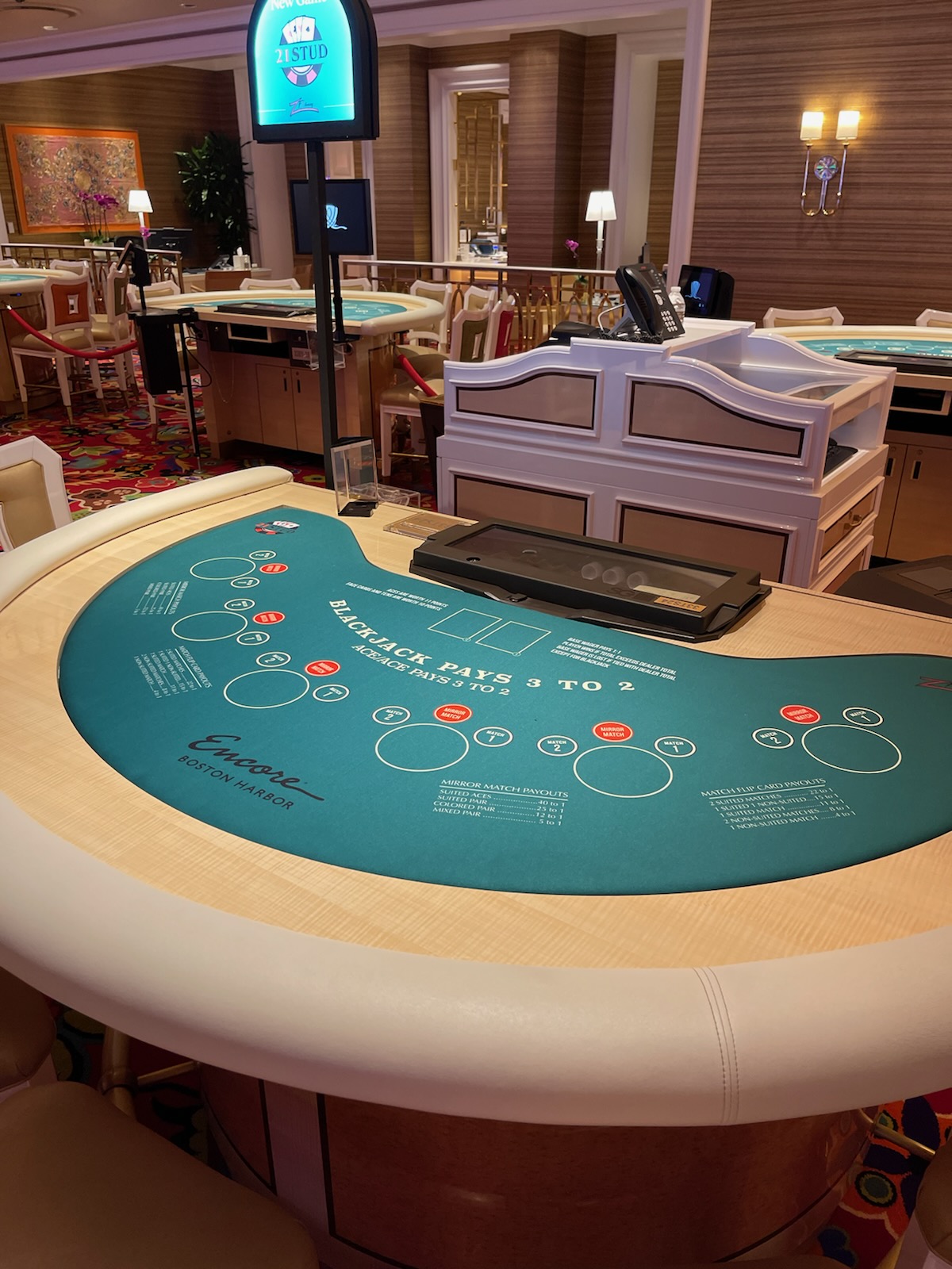 21Stud — это простой вариант блэкджека, не требующий принятия решений. Обе стороны, игрок и дилер, получают по две карты, и побеждает та сторона, у которой больше очков. По состоянию на ноябрь 2022 года в эту игру играли в Encore в Бостоне и в Boston Billiard Club and Casino в Нью-Гэмпшире. Я слышал, что скоро игра появится в казино Eagle Mountain в Калифорнии.