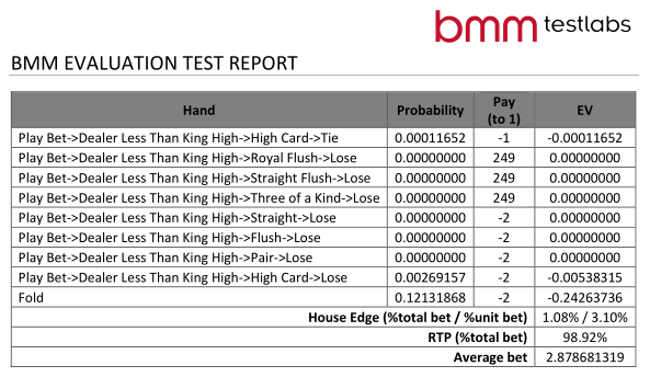 Ниже представлены скриншоты из математического отчета BMM, демонстрирующие вероятность и вклад в доходность всех возможных событий в соответствии с таблицей выплат 1 карты «3 Card Monster».
