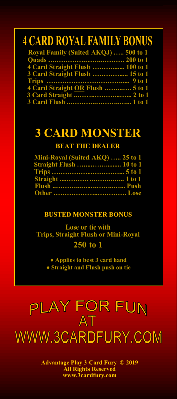 - «Три карты монстра» — эта ставка разыгрывается всегда. Выплата производится следующим образом, в зависимости от руки игрока и её соответствия руке дилера: