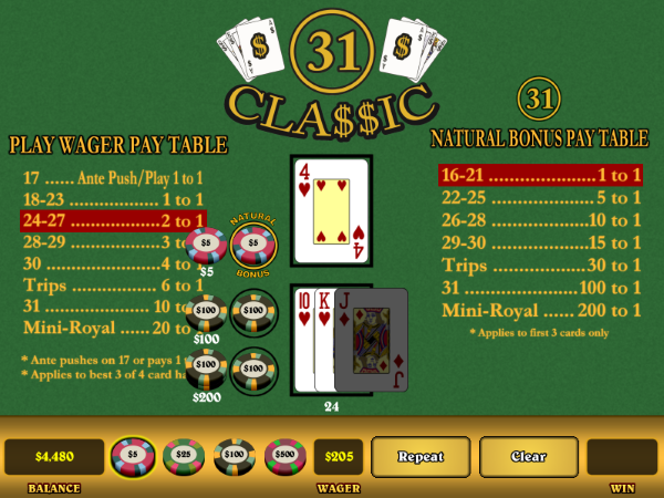В раздаче выше у меня было 20 очков червей после первых трех карт, поэтому я сделал ставку «Играть». Картой «Потянуть» была четверка червей, в сумме 24 очка червей. При 24 очках мой анте принес мне равную прибыль, а ставка «Играть» — 2 к 1. Бонус «Натуральная 31» выплачивается исходя из моих первоначальных трех карт, сумма которых составляла 20 очков, что дает выплату 1 к 1.