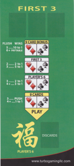 Здесь представлены сканы обеих сторон карточки с правилами. Щелкните по любому изображению, чтобы увеличить его. В правилах указано, что первые три карты являются «общими картами», но когда я играл в Ballys, каждый игрок получал свои собственные карты.