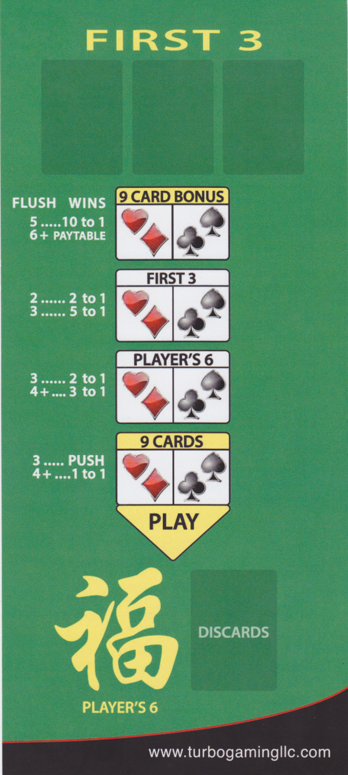 - Игрок также может делать дополнительные ставки на бонусы «Первые 3», «Шесть игроков» и «9 карт». В каждом случае игрок должен поставить на карту того же цвета, что и в ставке на «9 карт».