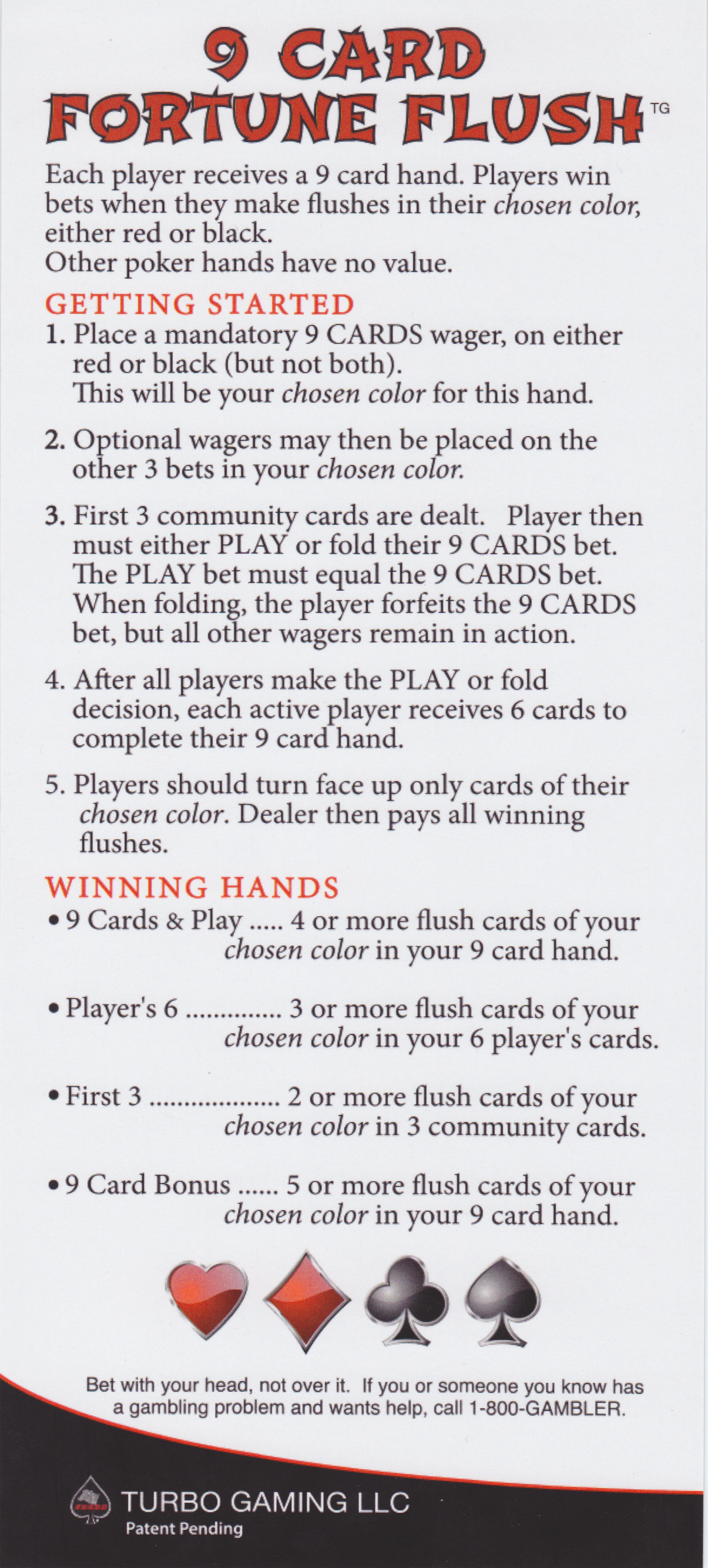 Здесь представлены сканы обеих сторон карточки с правилами. Щелкните по любому изображению, чтобы увеличить его. В правилах указано, что первые три карты являются «общими картами», но когда я играл в Ballys, каждый игрок получал свои собственные карты.