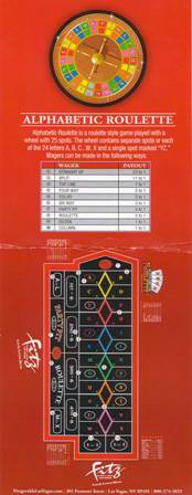 Алфавитная рулетка — это вариант рулетки, который я видел в казино Fitzgerald's в Лас-Вегасе 7 августа 2011 года. Это простой вариант рулетки, включающий в себя как цвета, так и буквы. В ней 25 ячеек, по одной для каждой буквы от A до X, и по одной для Y и Z. Также есть шесть цветов, каждый из которых состоит из четырех букв. Буква YZ обрабатывается примерно так же, как и 0 в рулетке с одним нулем, и не имеет цвета.