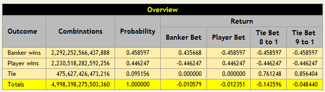 В приведенных ниже таблицах показаны возможные исходы ставок на Игрока, Банкира и Ничью в игре с 8 колодами. Как показано в нижних правых ячейках каждой таблицы, преимущество казино составляет 1,06% по ставке на Банкира, 1,24% по ставке на Игрока и 14,36% по ставке на Ничью.