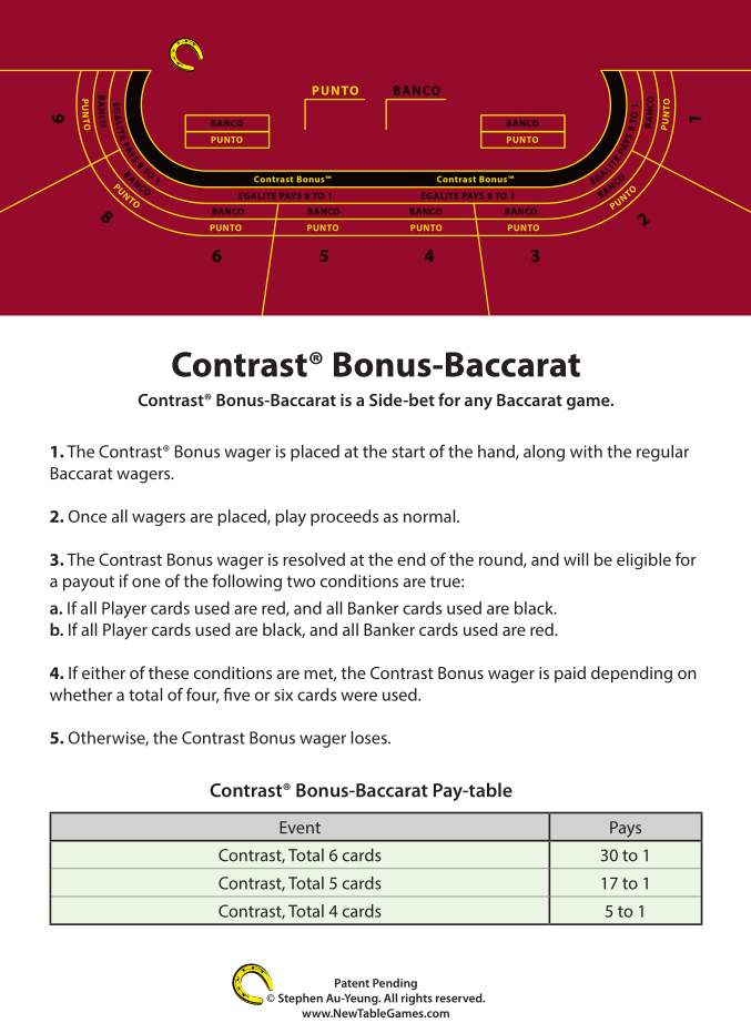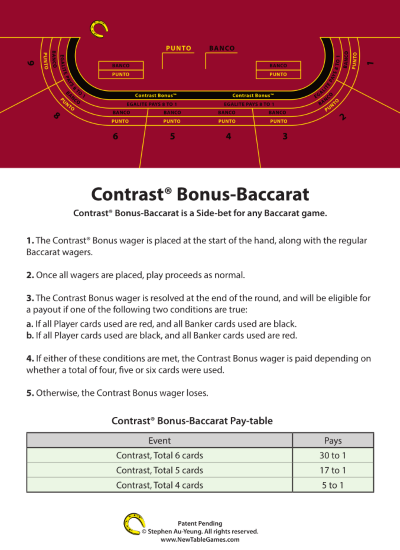 Бонусная ставка Contrast Bonus Baccarat — это дополнительная ставка в баккара, которая выплачивается, если все карты Игрока одного цвета, а все карты Банкира — противоположного цвета. Выигрыш зависит от суммы выпавших карт. Впервые эта ставка появилась в казино Admiral в Швейцарии.