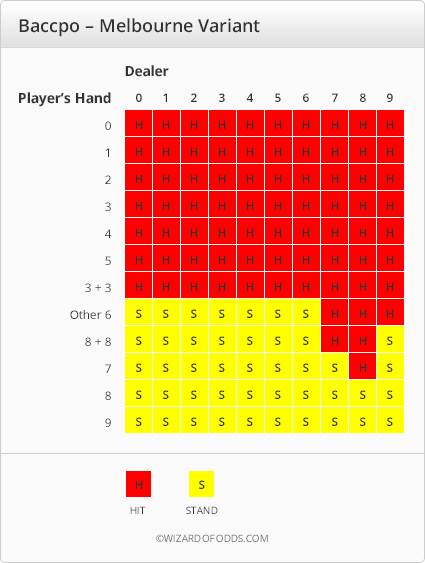 В следующей таблице показаны вероятность и доходность для всех возможных исходов мельбурнского варианта игры при условии оптимальной стратегии. В нижней правой ячейке показано преимущество казино в 3,02%.