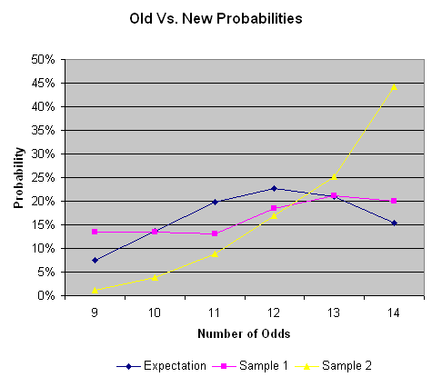 Очевидно, что карточка с очень небольшим количеством нечетных чисел будет иметь хороший старт и гораздо больше шансов на выигрыш, чем карточка с преимущественно нечетными числами. В июльском номере журнала Las Vegas Advisor за 2002 год я написал статью о гигантском бинго, основываясь на предположении, что карточки создавались случайным образом. Один из читателей этой колонки сказал мне, что, по его мнению, карточки не создавались случайным образом, о чем свидетельствует тот факт, что он купил 1500 карточек, и на всех них суммарное количество нечетных чисел находилось в диапазоне от 9 до 14.