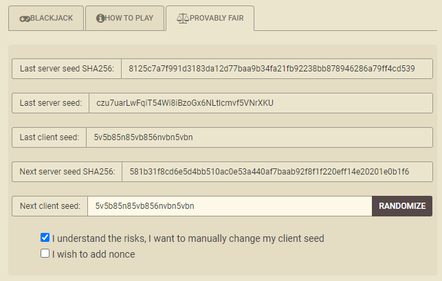 Изображение выше, взятое из панели «Честная игра», было сделано до того, как была сделана ставка. Для обеспечения честной игры необходимо ввести и записать новый клиентский сид (подойдет набор случайных символов) и хеш следующего серверного сида, который игра называет «Следующий серверный сид SHA256». Вот они: