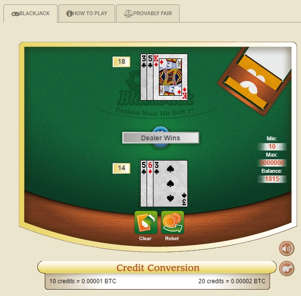 На изображении выше я начинаю со ставки в 0,00001 BTC (биткоина), что эквивалентно примерно 10 центам. Игроку предлагается использовать эту ставку, чтобы купить десять фишек, а затем поставить все десять. Зачем они усложняют ситуацию этим шагом, я не знаю.