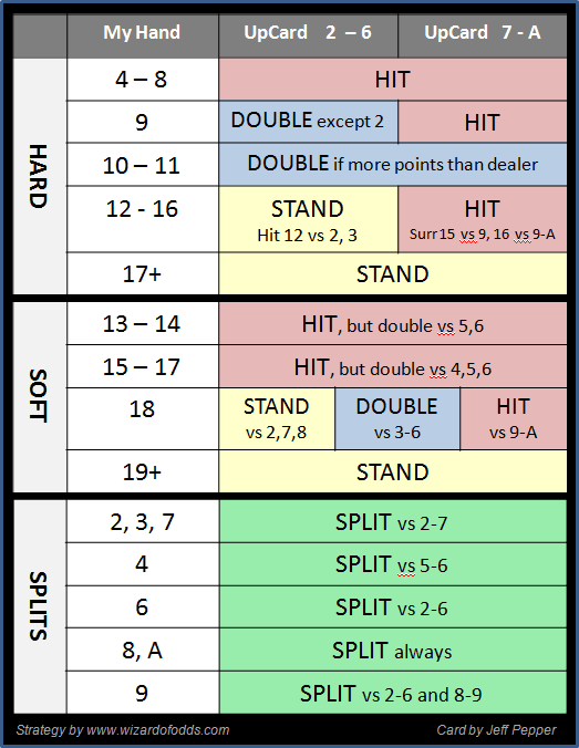 Читатель по имени Джефф предоставил еще одну таблицу моей простой стратегии, с исключениями, напечатанными мелким шрифтом. Подробности о простой стратегии Волшебника можно найти в приложении 21 к моей книге о блэкджеке .
